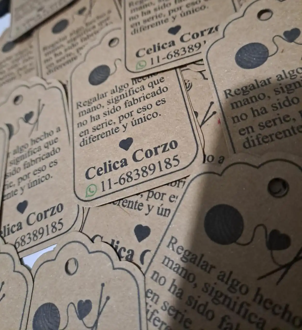 Etiquetas con tu logo en papel kraft de 180 grs. Una sola cara impresa. Perforadas. No incluye hilo. 1 Diseño básico Precio x 50 unidades